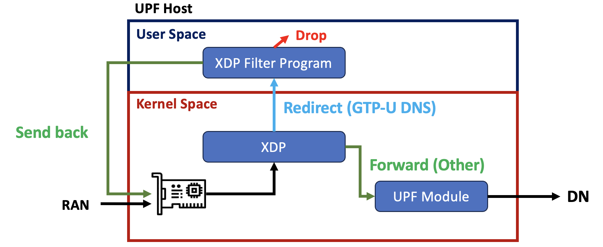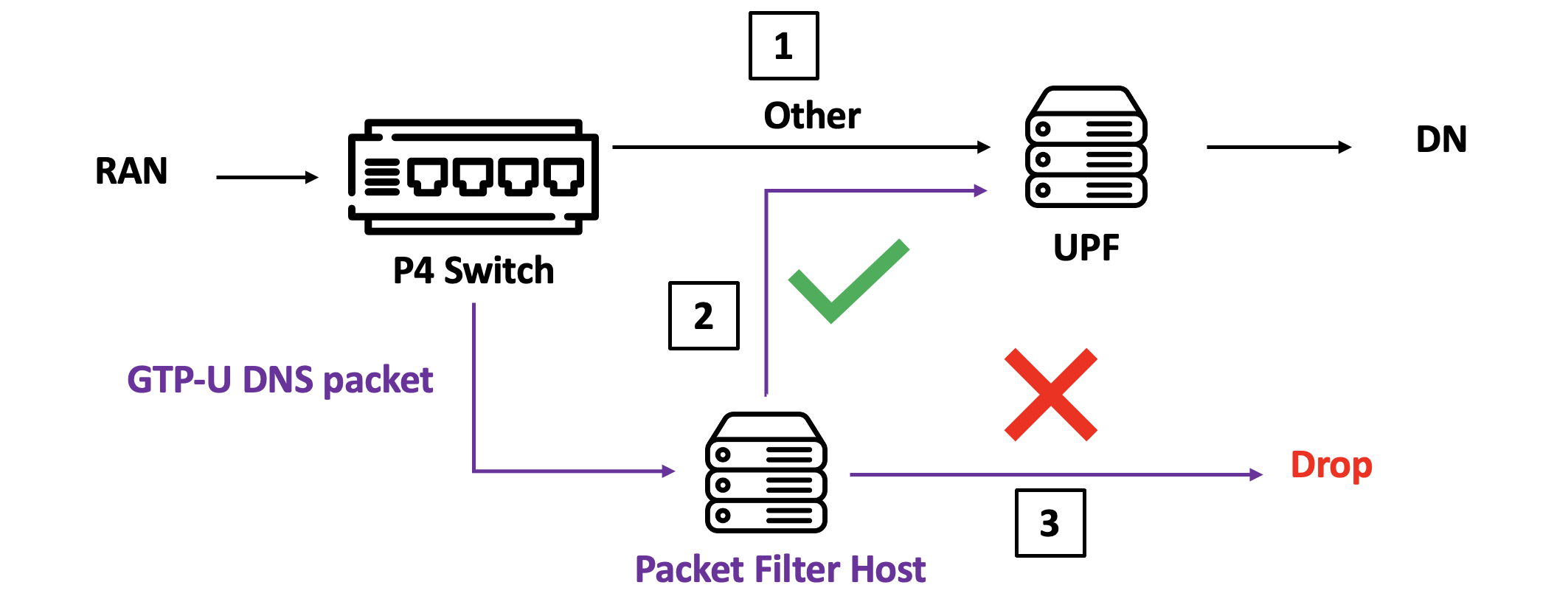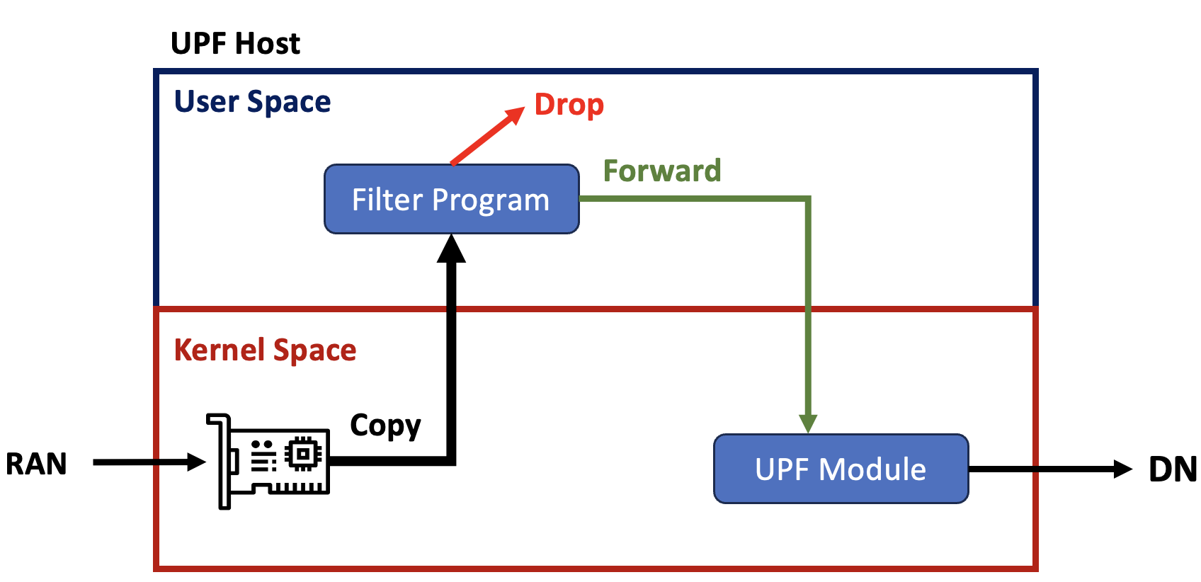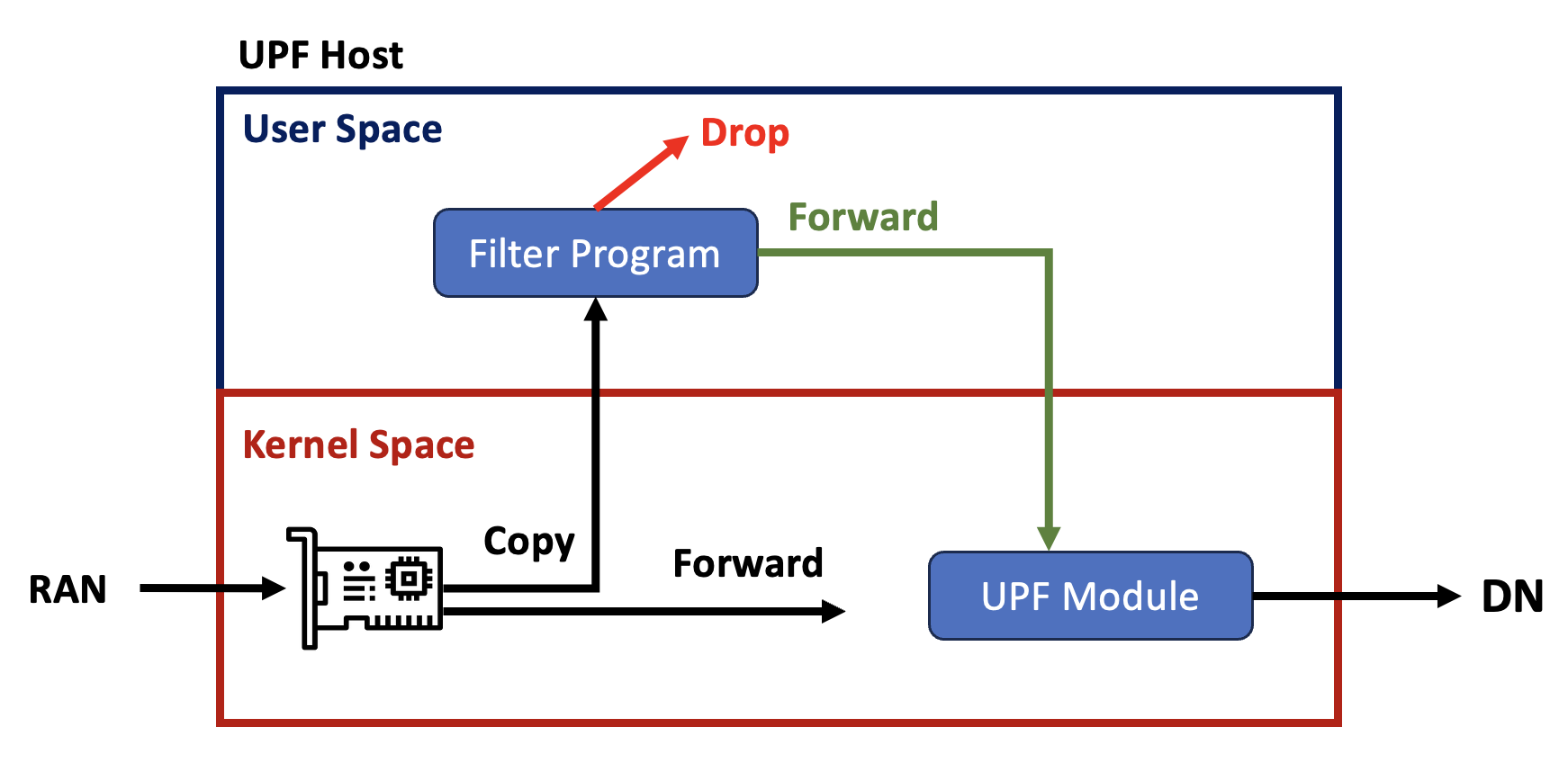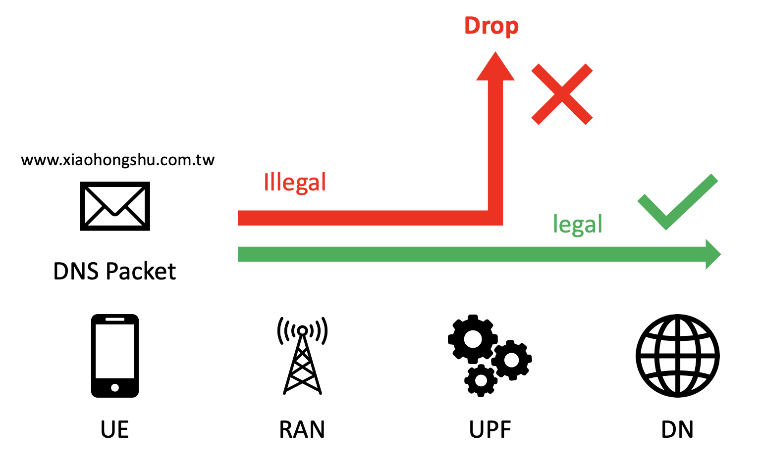 The mechanism looks like this. When the packet is valid, it will forward to DN through RAN and UPF, drop the packet otherwise.