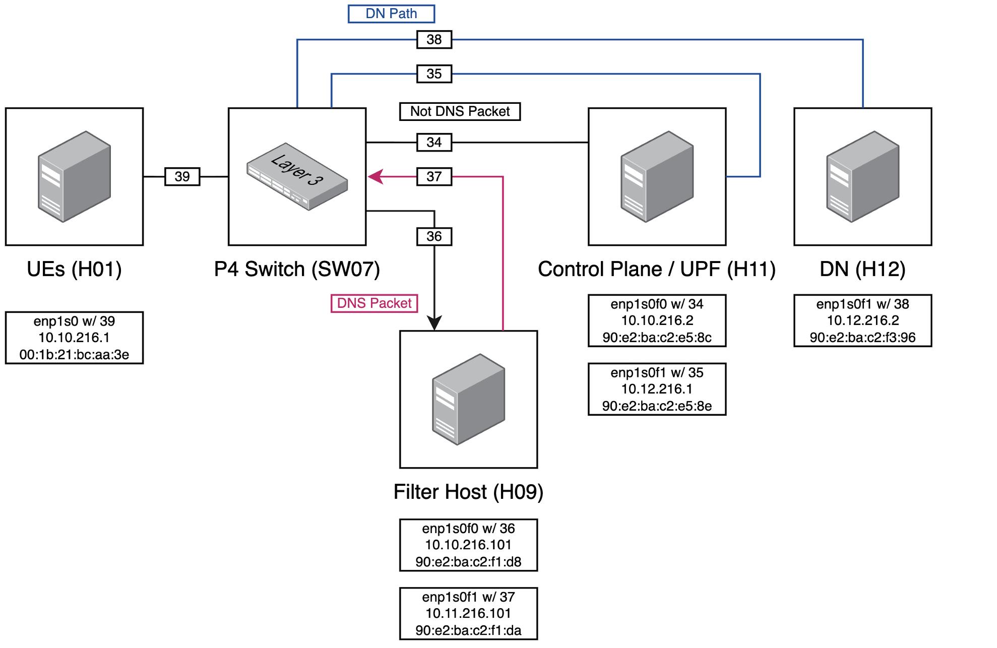 We will use this setup for all method, and adjust the policy on P4 switch to make it fit method requirement. For example, the GTP-U DNS packet will output to Filter Host for P4 Assist Swtich method, and GTP-U DNS packet will output to UPF Host directly for XDP method.
