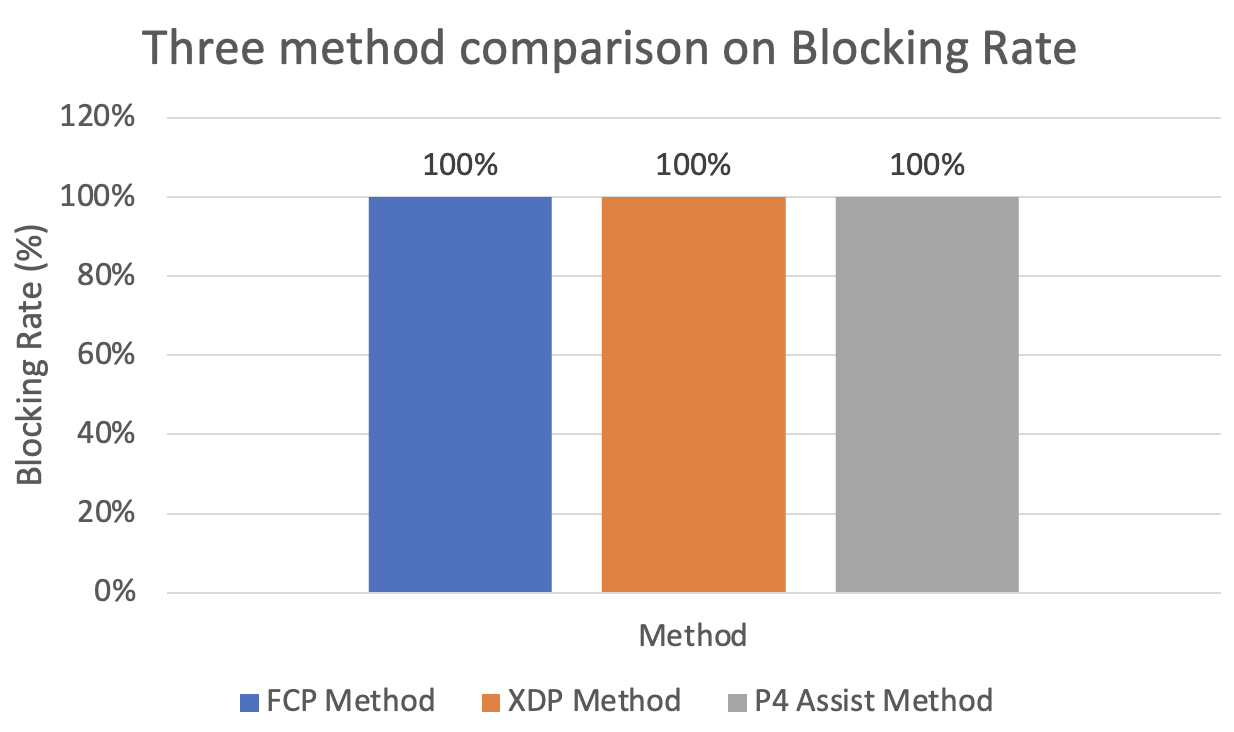 For the blocking rate, all method achieve 100%. It's not surprise since it will detain the packet and verify the packet. The invalid packet is impossible to forward without forward operation by validator.
