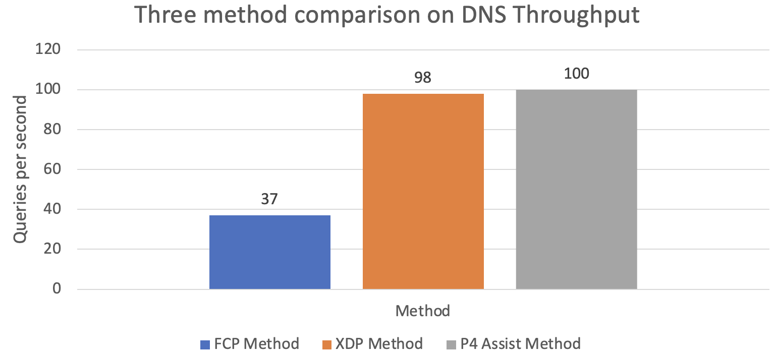 For the DNS throughput, it shows that our system can accept how much DNS packet in parallel. For XDP and P4 Switch, it almost have 100 qps (queries per second).