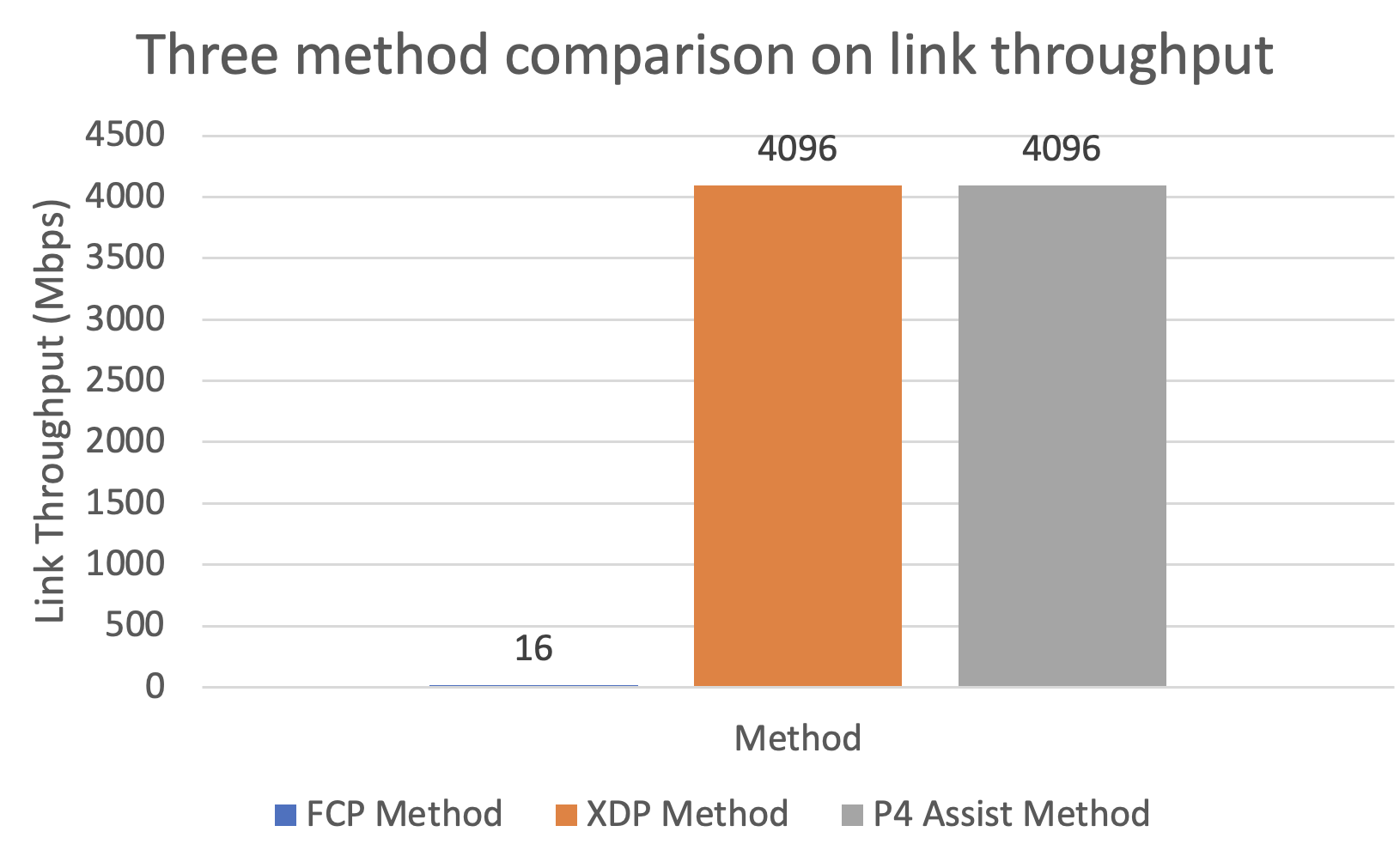 For the FCP Method, it have poor link throughput that only remain 16 Mbps link throughput (0.3% link throughput of P4 Assist Switch Method). It shows that the latency will damage the link throughput seriously.
